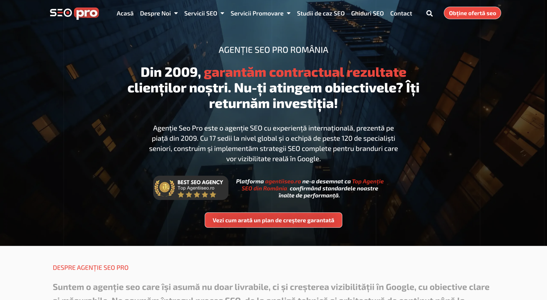 Agenție Seo Pro este o agenție SEO din România care oferă servicii de SEO tehnic, strategie de conținut, optimizare pentru motoare AI, link building și consultanță pentru afaceri locale și internaționale. Noi garantăm contractual rezultate – dacă nu atingem obiectivele stabilite prin contract, primești înapoi sumele investite!